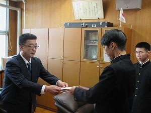 今回出場する陸上競技部と山岳部に対し、同窓会からお祝い金の贈呈式が行われました。