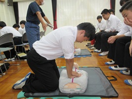日立消防署の救命指導員をお招きし、心臓マッサージやAED(自動体外式除細動器)の使用などについて話をしていただき、その後、実際に訓練用の人形を用いて蘇生の練習を行いました。