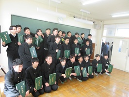 表彰式では、優秀な記録を収めた部活動や技能検定試験合格者への表彰が行われました。