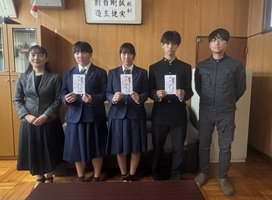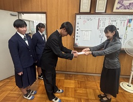 男子5000m競歩、女子やり投げ、女子砲丸投げで関東大会に出場する陸上競技部員4名へ同窓会より祝金が贈呈されました。