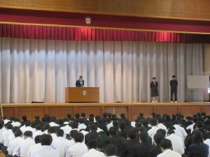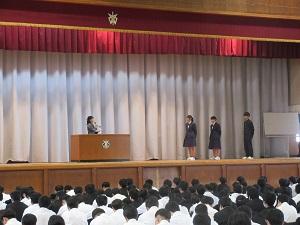 表彰式では、優秀な記録を収めた部活動の生徒や技能検定試験合格者への表彰が行われました。